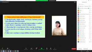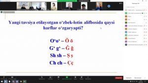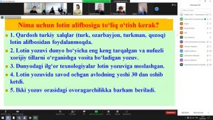 Nukus filialida joriy yilning 10-fevral kuni filialning “Ijtimoiy fanlar” kafedrasi mudiri N.A.Tlewbergenova va Qoraqalpog‘iston Respublikasi Qishloq xo‘jaligi va agrotexnologiyalar institutining o‘zbek tili fani o‘qituvchisi Fazu Sharjanovalar tomonidan Davlat tilida ish yuritish bo‘yicha “Yangi o‘zbek-lotin alifbosi” mavzusida zoom dasturi orqali onlayn seminar tashkil etildi. Seminarga filialning professor o‘qituvchilari, ishchi xodimlari va fevral oyi malaka oshirish kursi tinglovchilari qatnashdilar. ✅Seminarda O‘zbekiston Respublikasi Prezidentining 2019-yil 21-oktyabrdagi “O‘zbek tilining davlat tili sifatidagi nufuzi va mavqesini tubdan oshirish chora-tadbirlari to‘g‘risida”gi PF-5850-sonli Farmonida belgilab berilgan vazifalar haqida shuningdek lotin alifbosining bugungi kundagi ahamiyati va o‘zbek-lotin alifbosiga kiritilayotgan o‘zgarishlar haqida tushunchalar berildi.